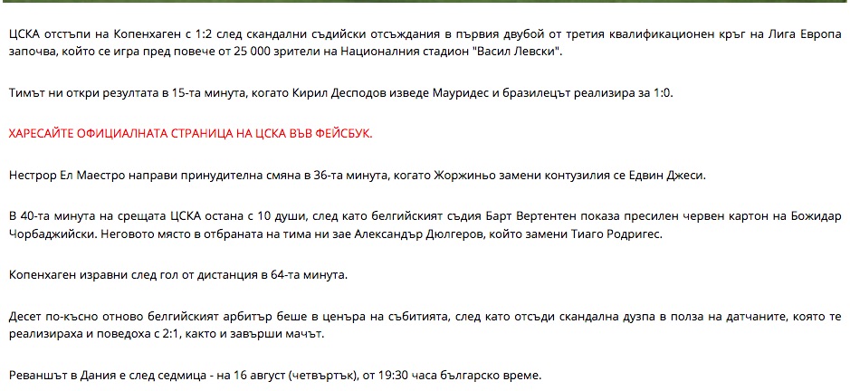 ЦСКА-София, чрез своя официален сайт, обвини съдията Барт Вертентен за домакинското поражение с 1:2 от Копенхаген. Според червените съдията е имал скандални отсъждания. Претенциите на тима са, че реферът е изгонил с пресилен червен картон Божидар Чорбаджийски и е отсъдил скандална дузпа в полза на датчаните.