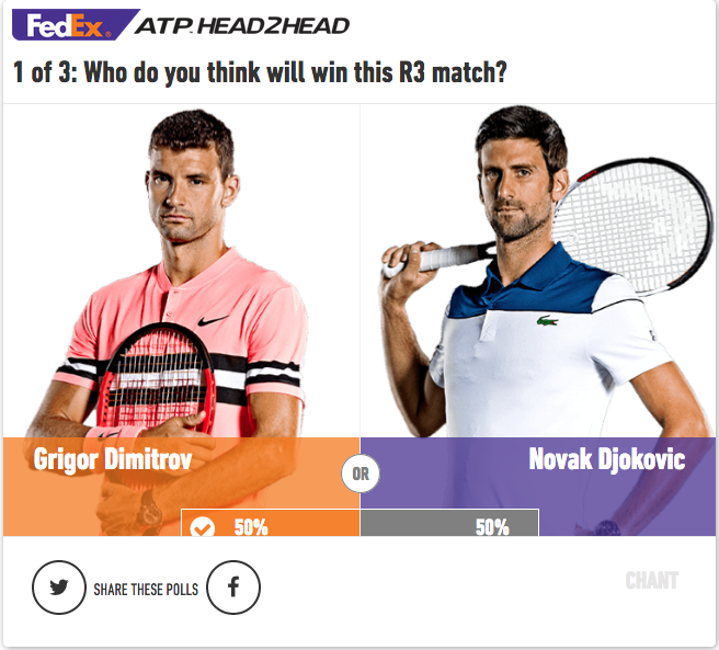 АТР попита феновете кой, според тях, ще спечели днешния сблъсък между Григор Димитров и Новак Джокович. Малко изненадващо, въпреки статистиката от преките двубои между двамата и баланса от 7-1 победи в полза на сърбина, почитателите на тениса дават минимално предимство на 5-ия в световната ранглиста българин. В полза на Григор са гласували 52% от участвалите в допитването, а за Джокович своя глас са дали останалите 48%. На пракика обаче феновете са разделени между двамата и шансовете клонят към равенство.