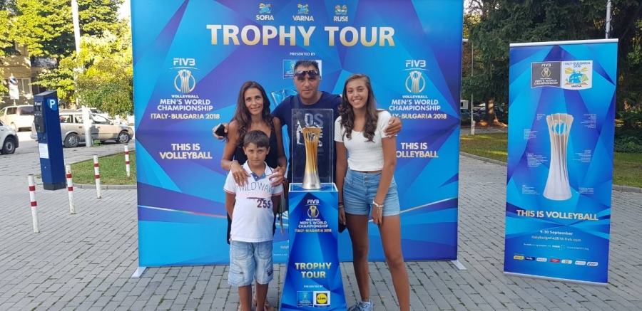 Страхил, Калинка, Жулиен и Томас. Едно четиричленно българско семейство, което от 20 години живее в Италия и е обединено около една голяма любов – тази към волейбола! Четиримата изминават разстоянието от родния Лясковец до Велико Търново, за да видят отблизо златната световна купа. Уникалният трофей беше изложен на входа на парк „Марно Поле“ като част от „Трофи Тур 2018“, който се организира от Българска федерация по волейбол и нейният партньор Лидл България. Щастливото семейство си направи снимки за спомен с отличието, което на 30 септември ще се озове в ръцете на най-добрия отбор на планетата, и си пожелаха това да бъде селекцията на Пламен Константинов!