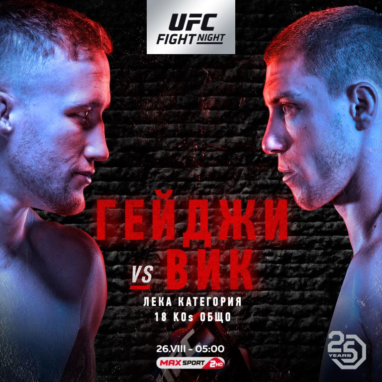 По традиция ранните часове на неделния ден по MAX Sport 2 са отредени за бойните спортове. Джъстин Гейджи и Джеймс Вик са двама от най-атрактивните бойци в лека категория на UFC, като Гейджи е и сред големите любимци на феновете, заради своите поразяващи нокаутиращи удари, донесли му 15 от общо 18 победи в кариерата. В ранните часове на неделния ден 29-годишният боец от Аризона се изправя срещу 31-годишния Вик, който има само 1 поражение в професионалната си кариера досега. Галавечерта на UFC от Линкълн, Небраска, ще се излъчва на живо от 05:00 часа на 26 август по MAX Sport 2.