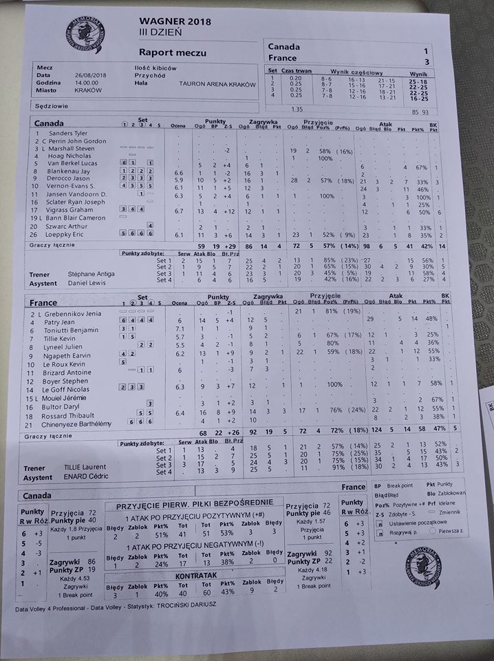 Резервата Тибо Росар стана най-резултатен за “петлите” с 16 точки (3 аса, 1 блок, 55% ефективност в атака, 24% перфектно и 76% позитивно посрещане), а звездата Ървин Нгапет, който игра само в първите 2 части добави още 13 точки (1 ас, 55% ефективност в атака, 18% перфектно и 59% позитивно посрещане). Диагоналът Жан Патри се отличи с 14 точки (48% ефективност в атака).