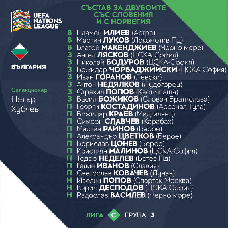 Селекционерът на националния отбор по футбол на България Петър Хубчев обяви пълния списък на разширения състав за мачовете със Словения (в Любляна на 6 септември) и Норвегия (в София на 9 септември). За първи път от дълги години цели 16 играчи от родното първенството попадат сред 23-та футболисти, които ще представляват "трикольорите" в първите мачове на новия турнир на УЕФА - "Лигата на нациите". Лошата новина за Хубчев е, че Спас Делев, който беше повикан, е аут поради контузия.