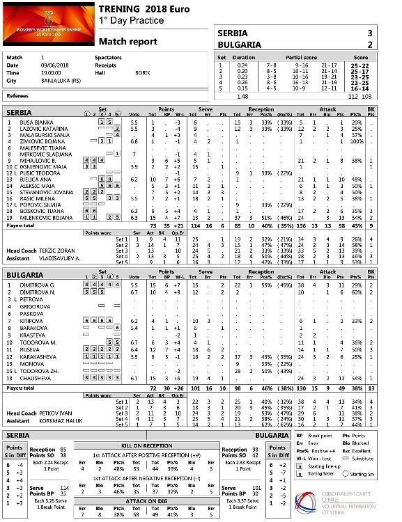Най-резултатни за българския тим бяха Силвана Чаушева (1 блок, 1 ас и 54% ефективност в атака) и Гергана Димитрова (2 блока, 2 аса, 29% ефективност в атака и 55% позитивно посрещане) с по 15 точки. За домакините от Сърбия Бояна Миленкович също завърши с 15 точки (2 блока, 54% ефективност в атака и 51% позитивно посрещане) за победата.