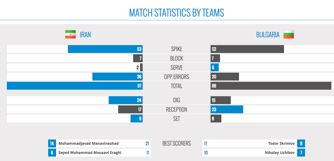 Страхотната игра на Сайед Маруфлакрани изведе иранците до успех с 25:20 след перфектна атака на Милад Ебадипур.