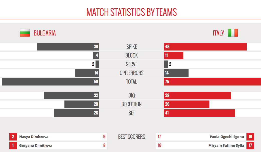 Паула Егону заби 17 точки (1 ас, 4 блока, 42% ефективност в атака), а Мириам Сила добави още 16 точки (1 ас, 1 блок, 58% ефективност в атака) за успеха на Италия.