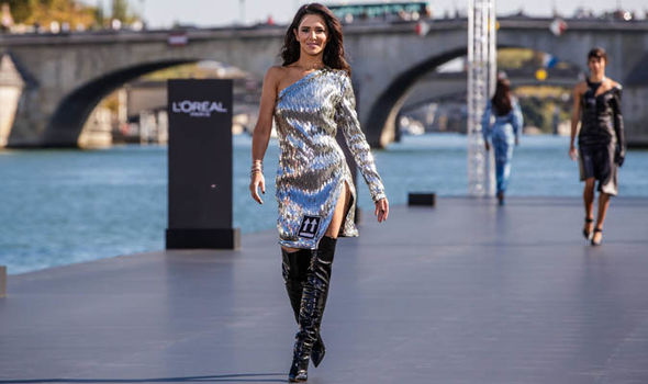 Красавицата е лице на популярна козметична марка и в качеството си на такава се появи на Седмицата на модата в Париж. В същото време певицата дефилира в ослепителна сребърна рокля с едно рамо.