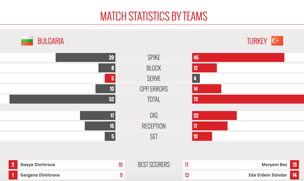 За Турция най-резултатна стана Мерием Боз със 17 точки, а Еда Ердем добави още 13 точки.