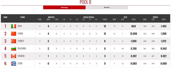 Българските "лъвици" се класираха за следващата фаза на Световното първенство, след като преди малко се наложиха над Канада с 3:1 гейма в последния си мач от Група В и завършиха на 4-о място в крайното класиране в групата с 2 победи, 3 загуби и 6 точки. Напред продължават и първите три отбора - олимпийският шампион Китай, непобеденият до момента тим на Италия и коравата Турция.