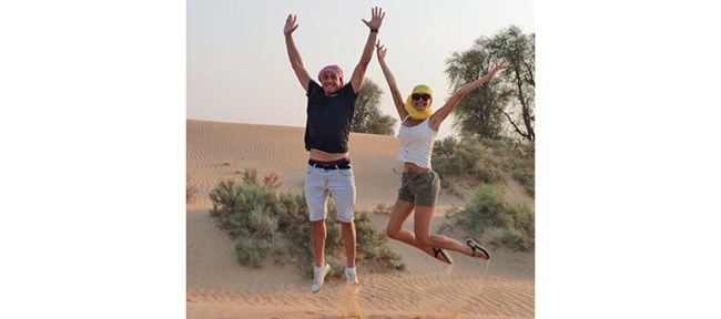 В Дубай освен гимнастичката и Александър надяна кърпа на главата и се превърна в същински бедуин. Така накипрени по местната традиция, двамата изглеждат изключително щастливи.