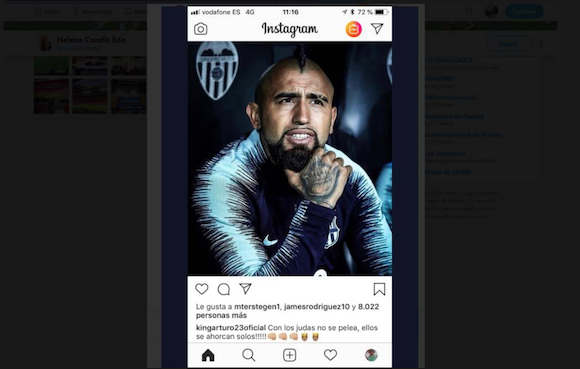 Новото попълнение на Барселона Артуро Видал отново демонстрира недоволство, без да посочи от какво точно. Преди дни халфът намекна, че не е щастлив, след като Ернесто Валверде не залага достатъчно на него. Снощи Видал пак не получи шанс, след като остана резерва при 1:1 срещу Валенсия. Тази сутрин чилиецът качи своя снимка от пейката в профила си в Instagram с текст “С юди не се бориш, те сами се бесят”. Малко след това той изтри публикацията.