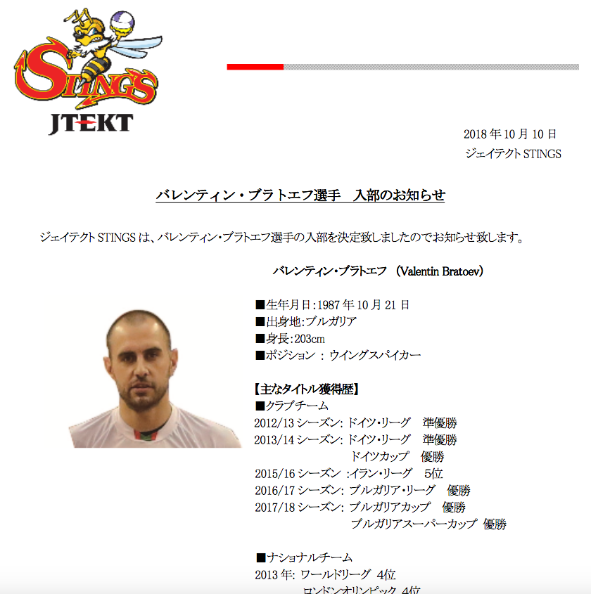Националът Валентин Братоев се присъедини към новия си японски клуб ДжейТЕКТ Стингс (Кария).