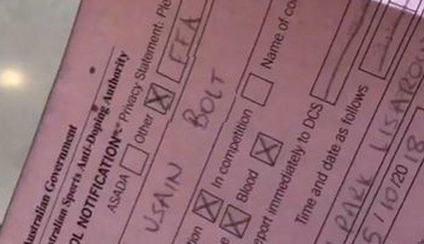 "Е, приятели, оттеглих се от леката атлетика с поглед към футбола, но вижте това", заяви Болт във видео в Instagram, като показа бележка за допинг тест.