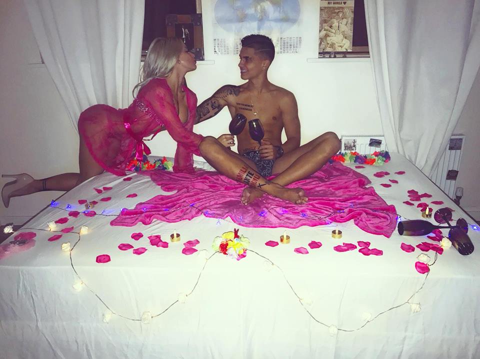 Защитникът очевидно се е постарал доста за романтичната вечер, което ясно личи от кадъра. Петров е посрещнал любимата си в легло, обсипано с розови цветчета и запалени ароматни свещи. Ивелина пък е заложила на предизвикателна розова рокличка, от която изпъкват едрите й форми.
