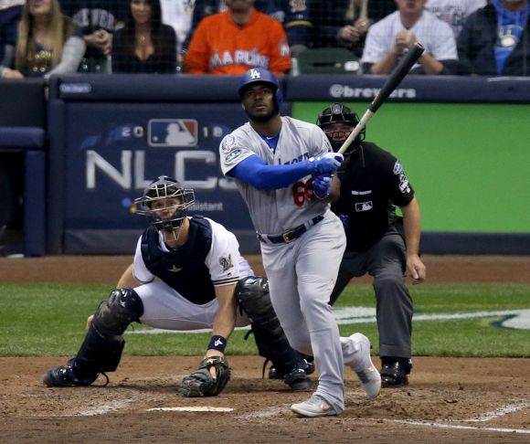 "Пивоварите" предизвикаха пълния формат на плейофа "4 от 7" с успех със 7:2 в петък вечер, но тази нощ нямаха достоен отговор срещу мощната атака в синьо-сиво. Домакините на ст. "Милър Парк" в Милуоки поведоха с хоумрън на Крисчън Йелич в 1-вия ининг, но още във 2-рия гостите от Калифорния обърнаха резултата с двоен удар над оградата на Коуди Белинджър срещу Йоулис Часин (L 2-1). В 6-ия пък Ясиел Пуиг изстреля могъщ троен хоумрън и окончателно смълча над 44 000 фенове по трибуните.