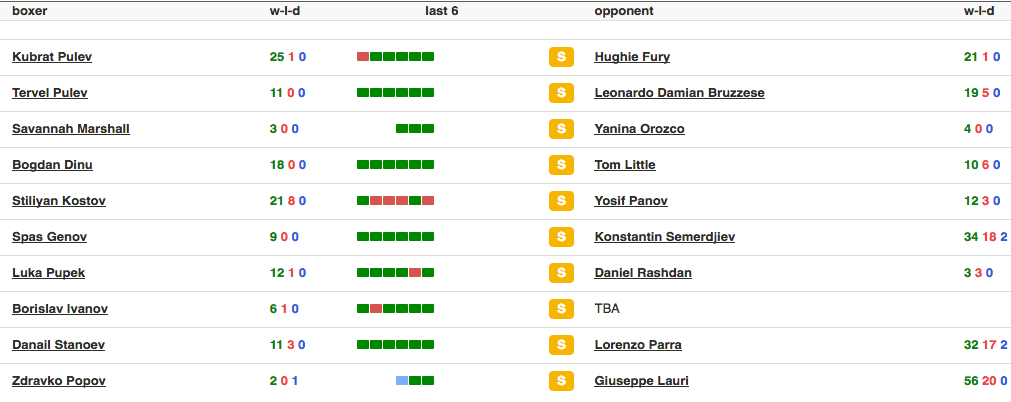 Три от подгряващите двубои ще бъдат за титли. Братът на Кубрат - Тервел излиза срещу италианеца Леонардо Брусезе. 12-рундовият сблъсък е за пояса на Европейския съюз в полутежка категория.