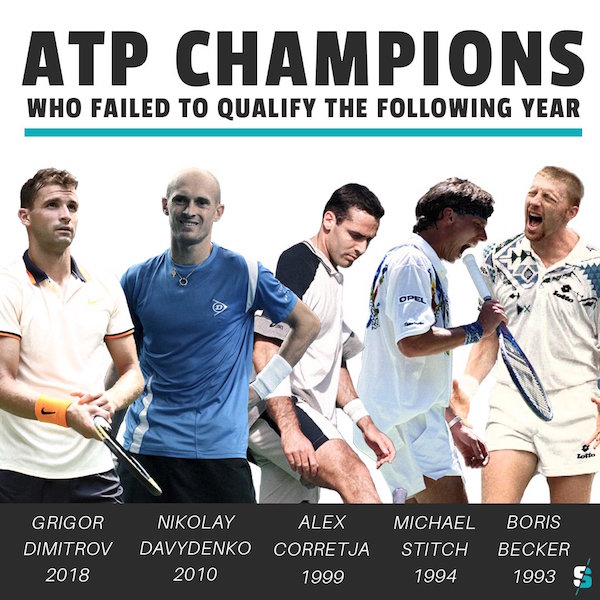 Григор Димитров е петият тенисист, който няма да защитава титлата си от Финалния турнир на ATP, след като е грабнал трофея в предходната година. Най-добрият ни тенисист се присъединява към германците Борис Бекер и Михаел Щих, испанеца Алекс Кореча и руснака Николай Давиденко. През 2010 година Давиденко става последният тенисист, който не успява да се класира за престижното състезание, след като го е спечелил в предишната година.
