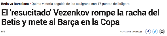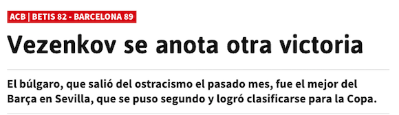 ""Възкръсналият" Везенков разби Бетис и класира Барселона за Купата”, пишат от Marca, като добавят, че Барселона стига до пета поредна победа, а Везенков има сериозен принос със своите 17 точки.