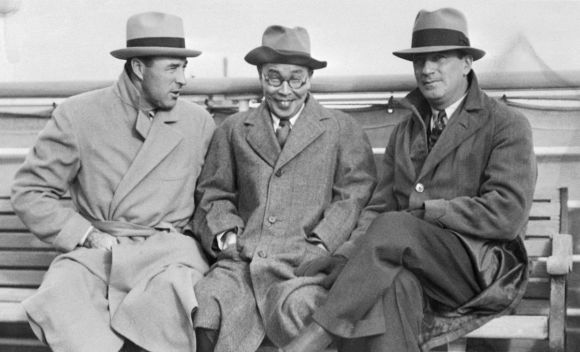 Мо Берг (вдясно) пътува заедно с Лефти О'Дул от Ню Йорк Джайънтс (вляво) и представителя на домакините Сотаро Сузуки с кораб към Токио за демонстративния мач през 1934 г.