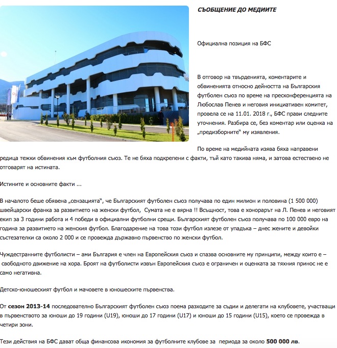 В отговор на твърденията, коментарите и обвиненията относно дейността на Българския футболен съюз по време на пресконференцията на Любослав Пенев и неговия инициативен комитет, провела се на 11.01. 2018 г., БФС прави следните уточнения. Разбира се, без коментар или оценка на „предизборните“ му изявления.