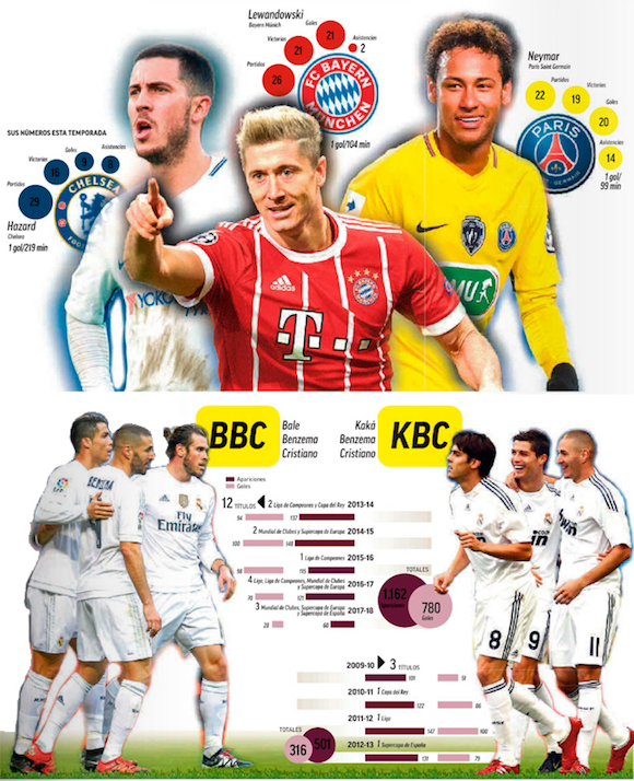 Трагичното представяне на Реал Мадрид в последно време е подтикнало президента Флорентино Перес да обмисли тотална чистка на звездните си нападатели. Плановете му са да замени Кристиано Роналдо, Карим Бензема и Гарет Бейл с Неймар, Роберт Левандовски и Еден Азар.