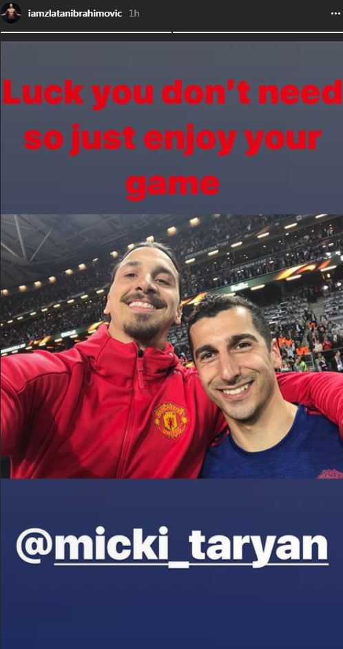 "Нямаш нужда от късмет, наслаждавай се на своята игра", написа Ибрахимович в профила си в Инстаграм. Шведският нападател от босненски произход и Хенрик Мхитарян изкараха година и половина заедно в Манчестър Юнайтед.