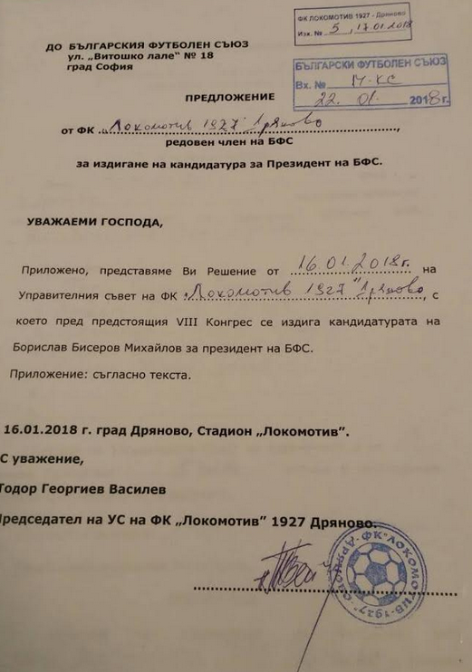 На 16 януари 2018 година се проведе второто заседание на УС на ФК „Локомотив 1927“ за годината. Ръководството на футболния клуб е единодушно и подкрепи кандидатурата на Борислав Михайлов за Президент на БФС за още един мандат, съобщават от клуба. На предстоящия конгрес през февруари, клубът ще бъде представляван от Президента на отбора – Тодор Георгиев /Теди Джорджо/. По време на срещата бе отчетено добрата работа и взаимодействие с Борислав Михайлов и екипа на БФС, както и добрата организация и дейност от ръководството на аматьорската лига на БФС, в лицето на Румен Вълков и Александър Шатровски.