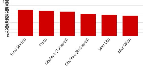 Изминалата седмица донесе много положителни емоции на мениджъра на Манчестър Юнайтед Жозе Моуриньо. Първо португалецът финализира трансфера на Алексис Санчес, след това поднови договора си с клуба, а в петък, навръх 55-ия рожден ден на Специалния, "червените дяволи" победиха с 4:0 Йоувил Таун и се класираха за 1/8-финалите на ФА Къп. Този двубой бе под №100 за Моуриньо в Манчестър Юнайтед. Равносметката показва, че отборът е записал победи в 62% от тези срещи. Този показател е вторият най-лош в успешната кариера на специалиста. Единствено с Интер Моуриньо има малко по-лош процент в първите си сто мача - 60%.