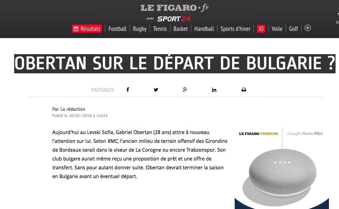 Габриел Обертан и Левски са пред раздяла. Това твърди авторитетното френско издание lefigaro.fr. Според информацията, 28-годишният халф е привлякъл вниманието на испанския Депортиво Ла Коруня и на турския Трабзонспор, които са изпратили до клуба една оферта за наем и една за трансфер, но от българския клуб не са склонни да се разделят с него.