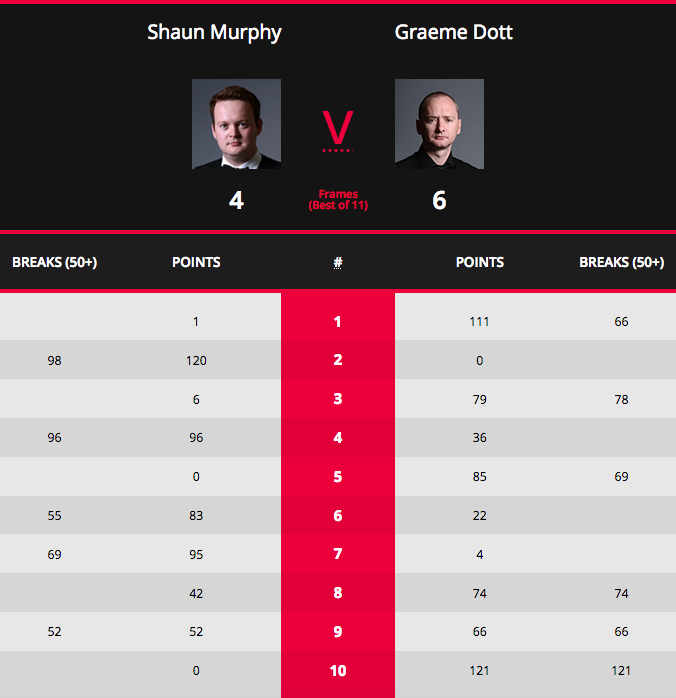 Греъм Дот пък е на ранкинг финал за първи път от осем години насам, след като срази Шон Мърфи с 6:4 в мач, който Магьосника доминираше през първата му половина, но изведнъж всички леки му неточности биваха наказвани от шотландеца. Дот е световен шампион от 2006 година и в China Open от 2007-ма, като се стреми да спечели едва третата си ранкинг титла, след като за последно се бори за такава в “Крусибъл” през 2010-а, когато загуби от Нийл Робъртсън.