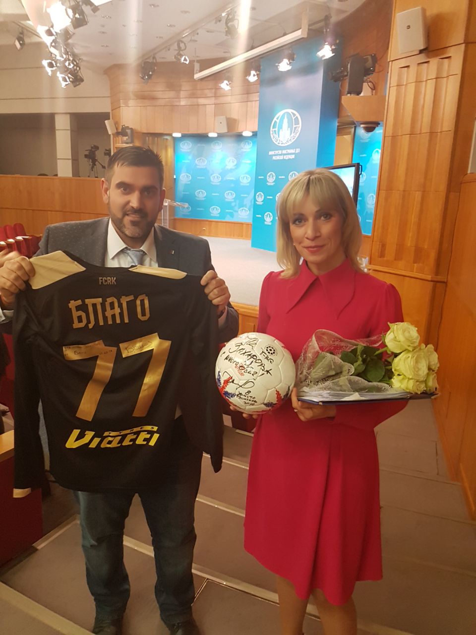 Христо Стоичков подари надписана топка на руския дипломат Мария Захарова. Това се случи навръх рождения ден на Камата, който се пада и Ден на руската дипломация. Освен това Камата ще подари копие на "Златната топка" на "Франс Футбол" на Владимир Путин, но все още не е ясно кой ще връчи ценния подарък на руския президент.