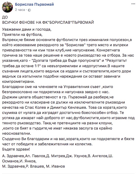 Въпреки,че бяхме основните футболисти през изминалия полусезон,в който извоювахме рекордното за "Борислав" трето място и въпреки привързаността ни към този клуб, ние напуснахме. Конкретната причина за това наше решение е новото ръководство на отбора. За нас указания,като - "Дузпата трябва да бъде пропусната" и "Резултатът трябва да остане 1:1" са невъзприемливи и недопустими. В нашите съзнания лицата, които веднъж са издали и състезателите, които дори веднъж са изпълнили подобни нареждания си остават завинаги компрометирани.