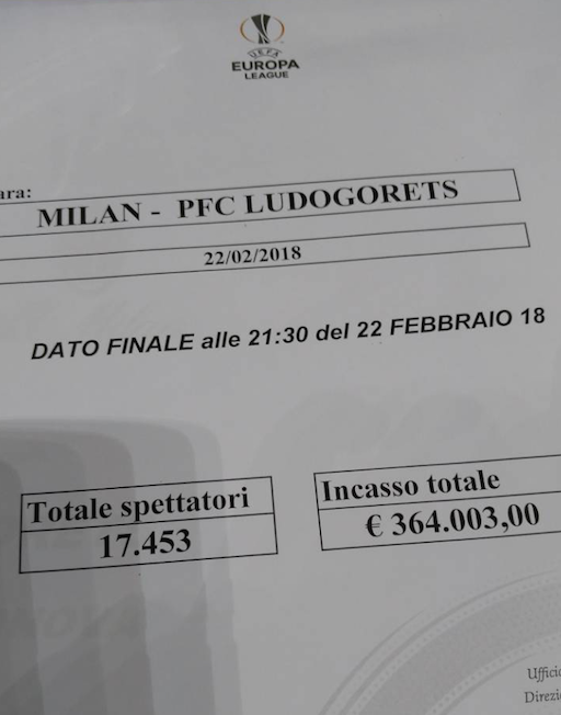 Ръководството на Милан прибира точно 364 000 евро от продадените билети за двубоя срещу Лудогорец в Лига Европа. Това гласи официалната информация, разпространена от домакините на "Сан Сиро". На трибуните на легендарния стадион в Милано са присъствали точно 17 453 зрители.