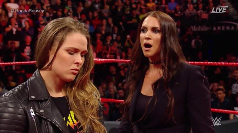 Ронда бе приета страхотно от публиката в залата, но истинското шоу бе на ринга. Трите Хикса очакваше бившата ММА звезда да подпише контракта, но вместо това получи тръшване върху масата.