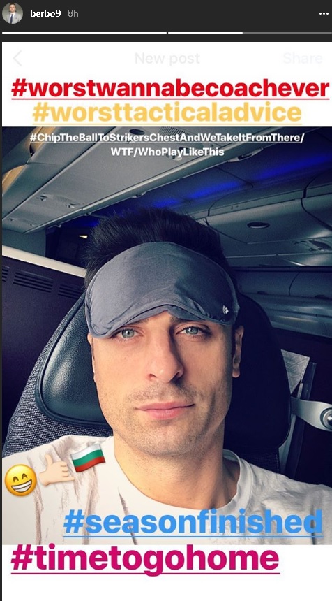 "Най-лошият, който се мисли за треньор. Най-лошите тактически съвети. Ритайте топката към гърдите на нападателите, след това те ще оправят. Кой, по дяволите, играе така? Сезонът свърши! Време е да се прибирам у дома", написа Бербатов към снимката.