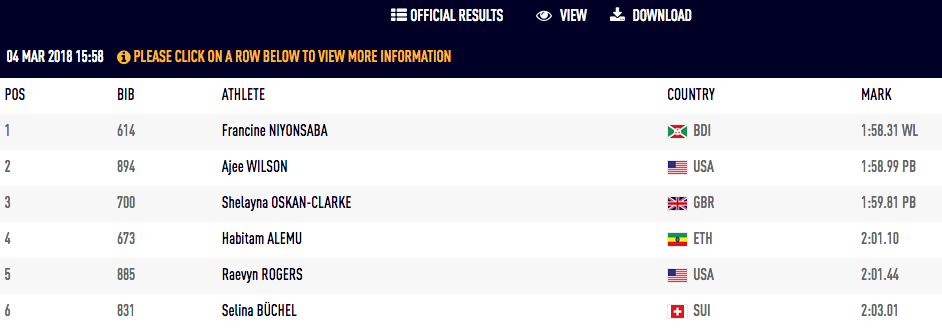 Франсин Нионсаба (Бурунди) спечели втората си поредна световна титла на 800 метра в зала. На планетарния форум в Бирмингам сребърната олимпийска медалистка от Рио де Жанейро 2016 и от Световното на открито в Лондон през миналата година стигна до успеха във финалните метри на състезанието, след като финишира за 1:58.31 мин - нов най-добър резултат в света за сезона.