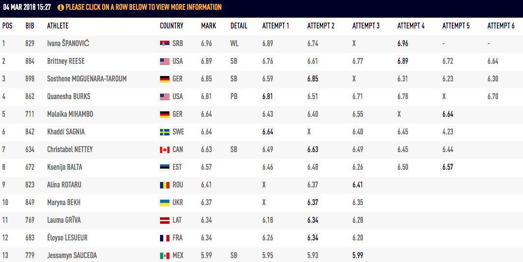 Ивана Шпанович спечели първата си световна титла при жените в скока на дължина в своята кариера. 27-годишната сръбкиня, която миналата зима триумфира с европейската титла на родна сцена в Белград, си осигури златото на планетарния форум в зала в Бирмингам с нов най-добър резултат в света за сезона от 6.96 метра. Бронзовата олимпийска медалистка от Рио де Жанейро постигна този резултат при четвъртото си излизане в сектора, а преди това имаше най-добро постижение от 6.89 м от първия опит. Така тя вече има пълен комплект медали от Световни първенства в зала след среброто в Портланд 2016 и бронза в Сопот 2014.