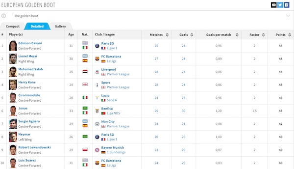Битката за “Златната обувка” за топреализатор на Европа продължава да бъде изключително оспорвана този сезон. Четирима футболисти делят първото място към момента. Всички те имат по 24 гола (48 точки). Това са Лионел Меси (Барселона), Хари Кейн (Тотнъм), Мохамед Салах (Ливърпул) и Единсон Кавани (Пари Сен Жермен). Има и един нападател с 30 попадения - бразилецът Жонас от Бенфика, но гол в португалското първенство се равнява на 1.5 точки.