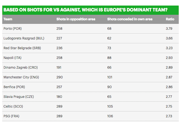 Порто е начело със средно 3.79 удара повече, пред Лудогорец с 3.66 и Звезда с 3.23. Наполи е 4-и с 2.93, а Динамо (Загреб) с 2.89 и Манчестър Сити с 2.87.