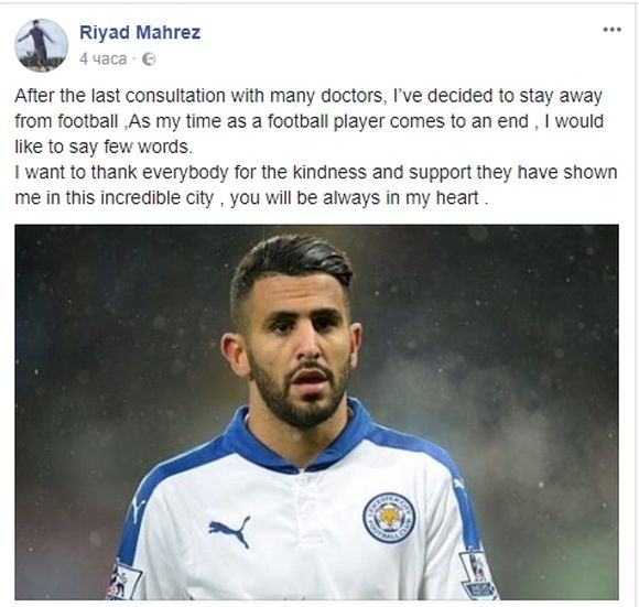 Халфът на Лестър Риад Марез прекратява кариерата си. Сензационната информация обиколи медиите в последните часове, след като на личния профил на футболиста във facebook се появи съобщение, в което той обяснява, че по медицински причини е принуден да се откаже от футбола.