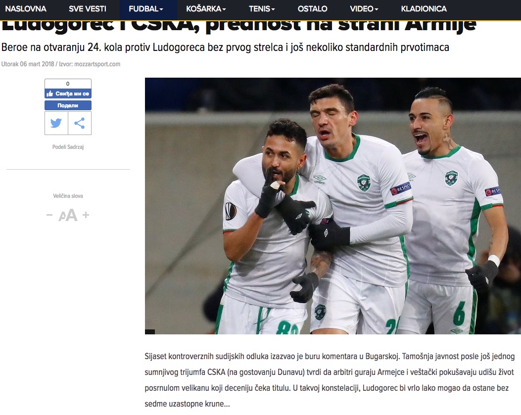 Сръбското издание mozzartsport.com обърна внимание на съдийските скандали в родното първенство. Медията твърди, че ЦСКА-София е постигнал съмнителна победа и в България изкуствено се опитват да го направят шампион.