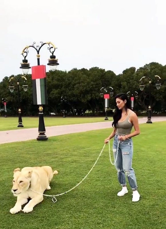 На снимките, публикувани в “Сън”, американската певица може да бъде видяна как си играе с орангутани, които са облечени в дрехи, храни с бутилка лъв с верига на врата и го разхожда.