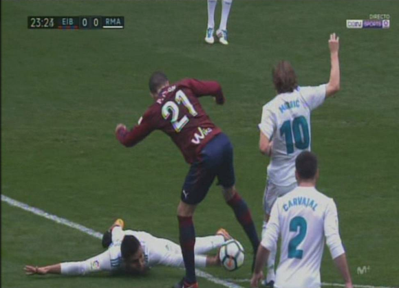 Последва неприятен момент, при който Рафаел Варан и Кике си удариха главите, та се наложи влизането на медицинските екипи. Бранителят на Реал така и не успя да влезе в кондиция и малко след това беше заменен от Начо Фернандес.