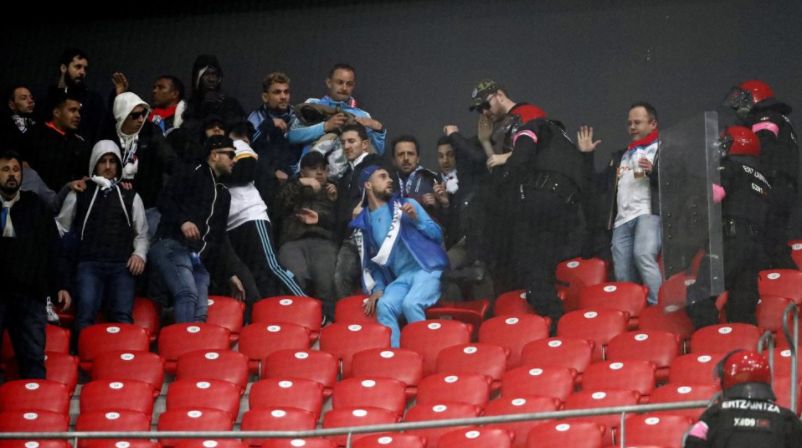 Неприятни инциденти помрачиха срещата между Атлетик Билбао и Олимпик Марсилия (1:2) от 1/8-финала в Лига Европа. Двама испански полицаи са пострадали, след като са били нападнати с ножове от фенове на гостите.
