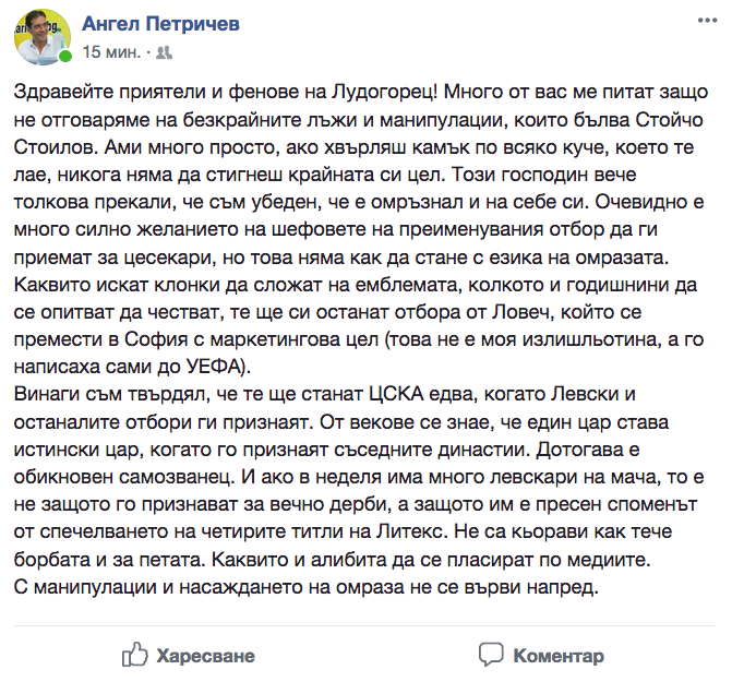 “Здравейте приятели и фенове на Лудогорец! Много от вас ме питат защо не отговаряме на безкрайните лъжи и манипулации, които бълва Стойчо Стоилов. Ами много просто, ако хвърляш камък по всяко куче, което те лае, никога няма да стигнеш крайната си цел. Този господин вече толкова прекали, че съм убеден, че е омръзнал и на себе си. Очевидно е много силно желанието на шефовете на преименувания отбор да ги приемат за цесекари, но това няма как да стане с езика на омразата. Каквито искат клонки да сложат на емблемата, колкото и годишнини да се опитват да честват, те ще си останат отбора от Ловеч, който се премести в София с маркетингова цел (това не е моя излишльотина, а го написаха сами до УЕФА).