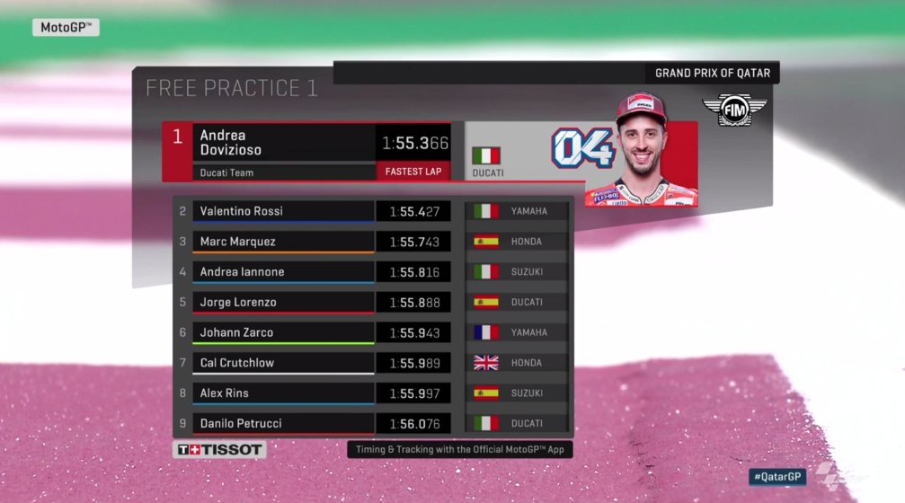 Пилотът на Ducati Андреа Довициозо записа най-бързата обиколка в първата тренировка от състезателния уикенд на MotoGP в Катар - 1:55.366 минути. Италианецът постигна това в последните 3 минути от сутрешната сесия на "Лосаил" и остави ветерана Валентино Роси на втора позиция. Топ 3 допълни защитаващият титлата си този сезон испанец Марк Маркес.