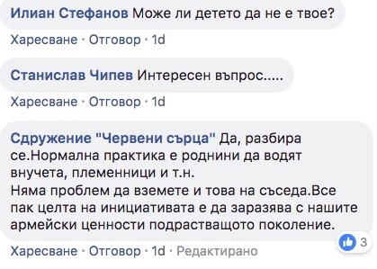 Отговор на Сдружение “Червени сърца”: Да, разбира се. Нормална практика е роднини да водят внучета, племенници и т.н. Няма проблем да вземете и това на съседа. Все пак целта на инициативата е да заразява с нашите армейски ценности подрастващото поколение.