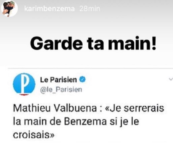 В интервю пред Le Parisien Валбуена заяви, че е готов да изглади различията си със сънародника си. “Ако ми се отдаде случай, бих му стиснал ръката”, признава настоящият играч на Фенербахче. Изглежда обаче, че Бензема все още му е сърдит. Нападателят качи в “Инстаграм” скрийншот с изказването на халфа, като от своя страна е написал: “Пази си ръката”.