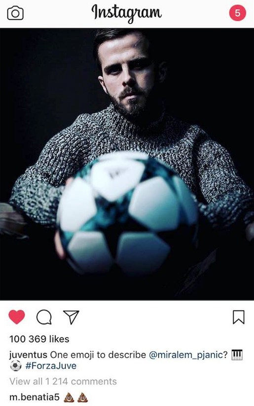 В социалната мрежа бе публикувана снимка на съотборника на Бенатия Миралем Пянич, под която тифозите на Юве трябваше да опишат своя любимец посредством емотиконка.