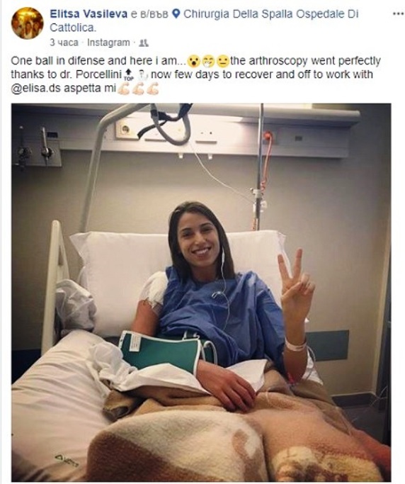 "Една топка в защита и аз съм тук... артроскопията мина перфектно благодарение на д-р Порчелини. Сегс няколко дни възстановяване и се връщам към работата", написа Елица Василева в профила си в социалните мрежи под публикуваната снимка.