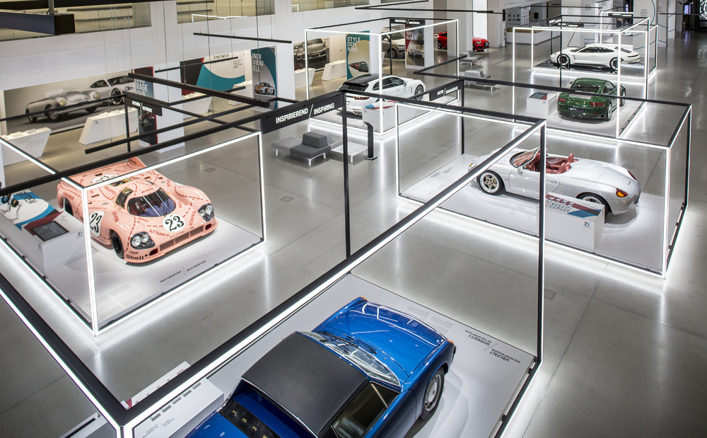 Изложението пренася посетителите десетки години и хиляди километри назад, но в същото време подсказва и идеите си за бъдещето. Porsche ги приветства на входа с Porsche 356 "No.1", която напомня за произхода на спортните автомобили. Следващият автомобил е Mission E – първият напълно електрически сериен модел на Porsche, който ще бъде представен на пазара през 2019 година. На централно място се намира едномилионното 911 в ирландско зелено, което излезе от фабриката през май 2017 година.